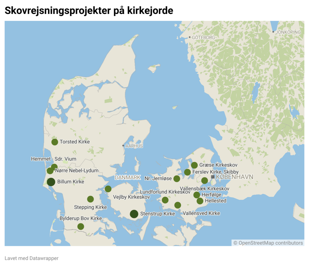 Folkekirken råder ifølge Aarhus Universitet samlet set over omkring 16.500 hektar. Skov dækker allerede en femtedel af det samlede areal for alle folkekirker i Danmark. En tredjedel af arealet optager bygninger, parkeringspladser, veje, kirkegårde og andre typer natur. Halvdelen af arealet dyrker landmænd, som har forpagtet jorden fra kirkerne. Igennem de 18 projekter planter de skov på 126 hektar af kirkernes jorde.