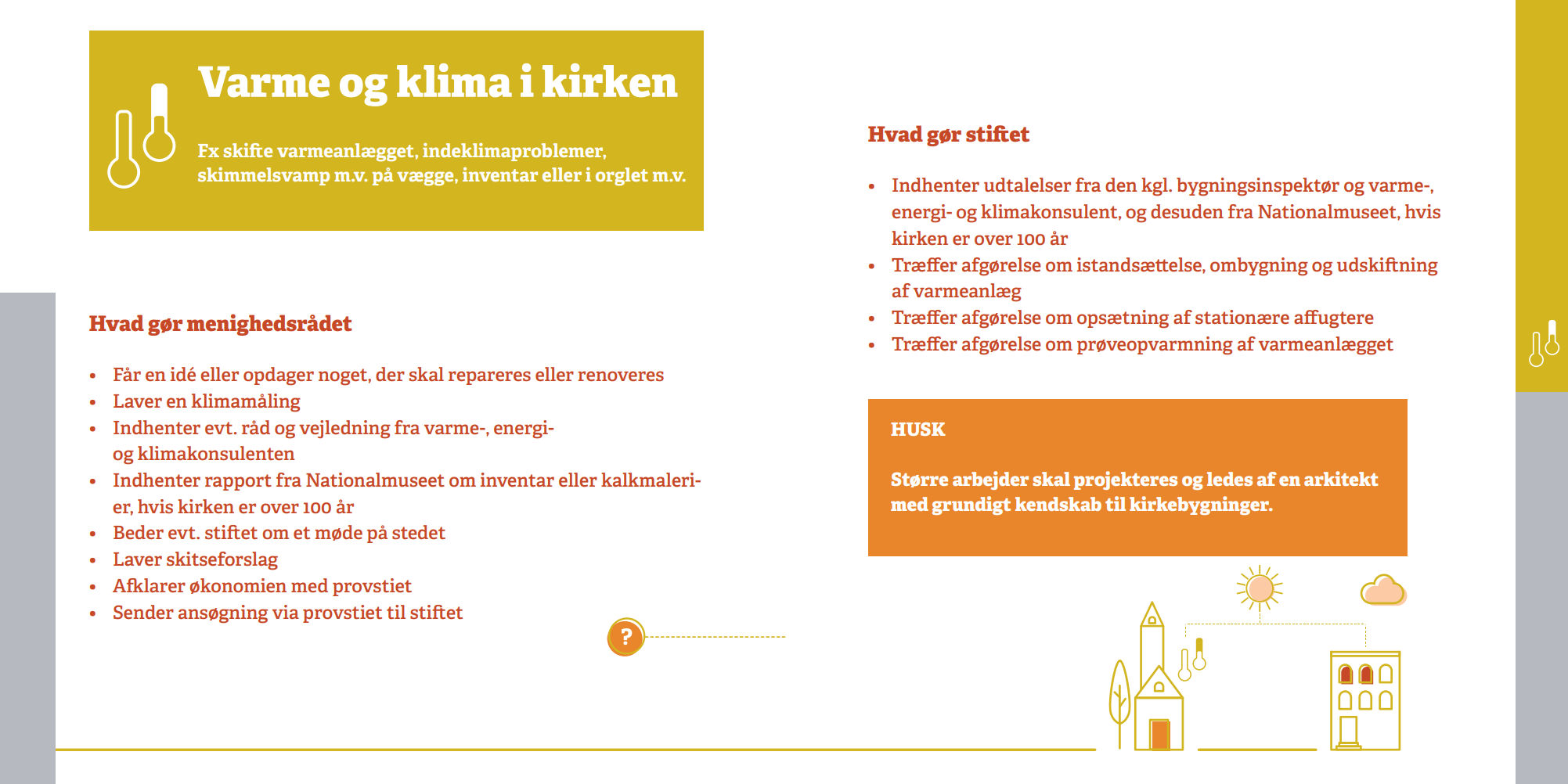 Det er vigtigt at begynde med at orientere sig i denne vejledning, da den giver en introduktion til byggesager og de særlige krav, der stilles til f.eks. for nye varmeanlæg i kirken. Man kan bl.a. få vejledning i nedenstående emner: